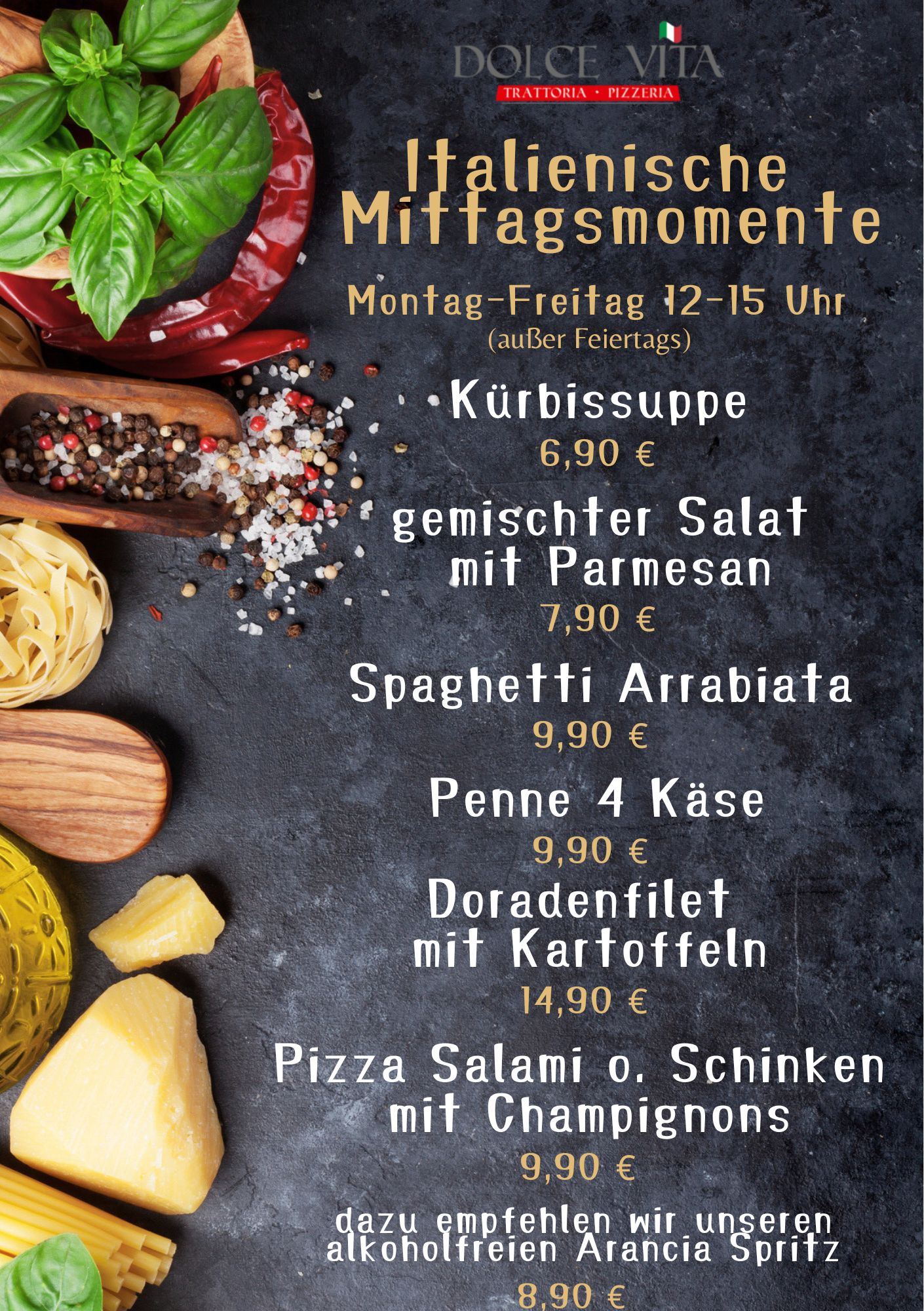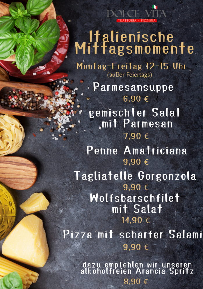 Mit unseren frischen und täglich wechselnden Angeboten nehmen wir Sie mit auf eine kulinarische Reise durch Italien, verwöhnen Sie mit typisch italienischen Köstlichkeiten und lassen Sie das mediterrane Lebensgefühl spüren.